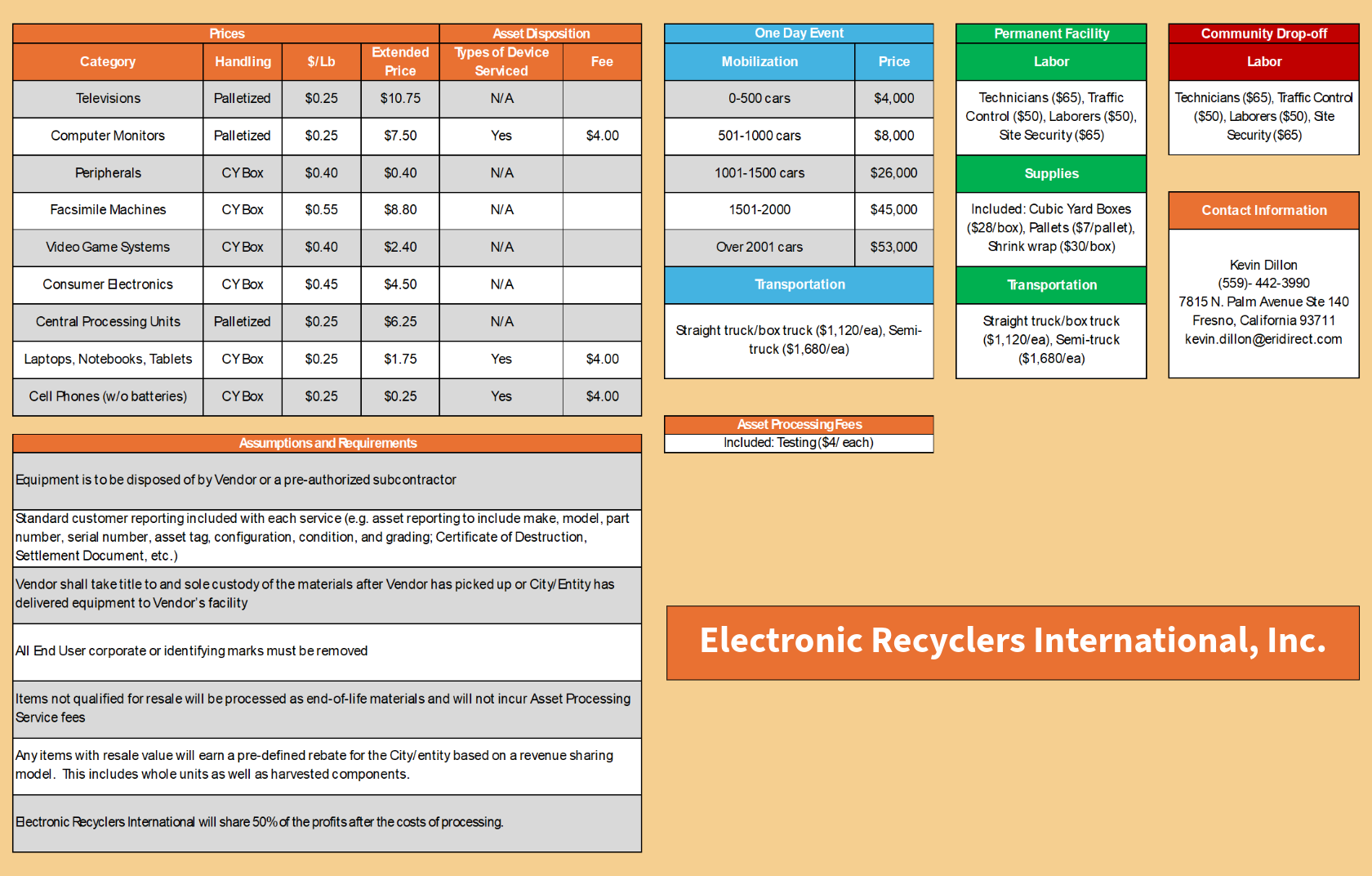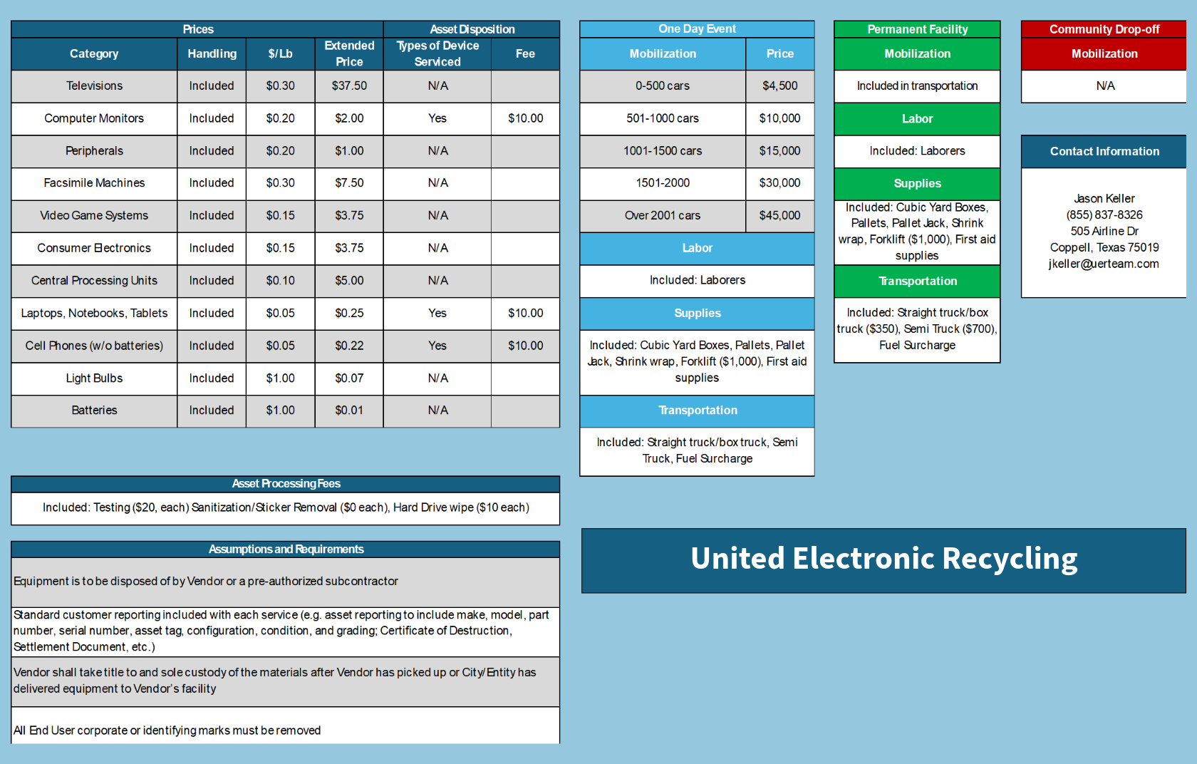 In 2019, NCTCOG released a Request for Proposals (RFP) to solicit vendors that could provide electronics recycling services to the region. In 2023, at the conclusion of the original agreements, NCTCOG released another RFP under the direction of the Resource Conservation Council. Two companies (Electronic Recyclers International and United Electronic Recycling) have been awarded Master Services Agreements, servicing electronics recycling within the North Central Texas region for preliminary three-year term. At the end of this term, vendors will be given the opportunity to renew their contract for two additional one-year periods. As vendors suitably participate in competitive pricing, they will provide services for permanent facilities, one-day events, drop-off of recyclables at the vendor’s facility, and asset disposition. Please find the Master Service Agreements and pricing outlines provided below. For any questions regarding the Regional Electronics Recycling Contract, or to utilize the listed services, please reach out to the individual companies for additional information.