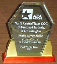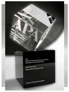 Civic leaders, elected and appointed officials, property owners, other stakeholders and interested citizens spent countless hours volunteering their time and hard work in order to develop a sustainable preferred future for the region. This award signifies recognition for our region’s efforts to bring a future to North Texas that is “better than business as usual”. The North Texas 2050 is an example of the collaboration and level of dedication necessary to achieve what APA considers “best planning practices”. Congratulations to everyone who has contributed to this innovative effort through service on the Vision North Texas Management Committee, Advisory Committee, research teams, volunteer corps and as participants.