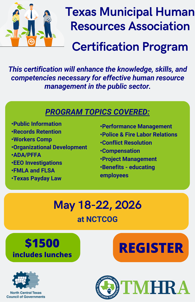 The TMHRA (Texas Municipal Human Resources Association) has developed a comprehensive professional certification tailored specifically for HR professionals working within municipal government. This certification will enhance the knowledge, skills, and competencies necessary for effective human resource management in the public sector. The program will cover essential topics such as public sector employment law, recruitment and hiring practices, employee relations, performance management, diversity and inclusion, and strategic workforce planning. Participants will engage in a blend of theoretical knowledge and practical applications, ensuring they are well-equipped to navigate the unique challenges faced by municipal HR departments. Upon completion, certified professionals will be able to demonstrate a commitment to excellence in human resource management, positioning themselves as leaders in their field. This certification will not only validate their expertise but also enhance their career opportunities within municipal organizations, fostering a culture of professionalism and continuous improvement in public service.