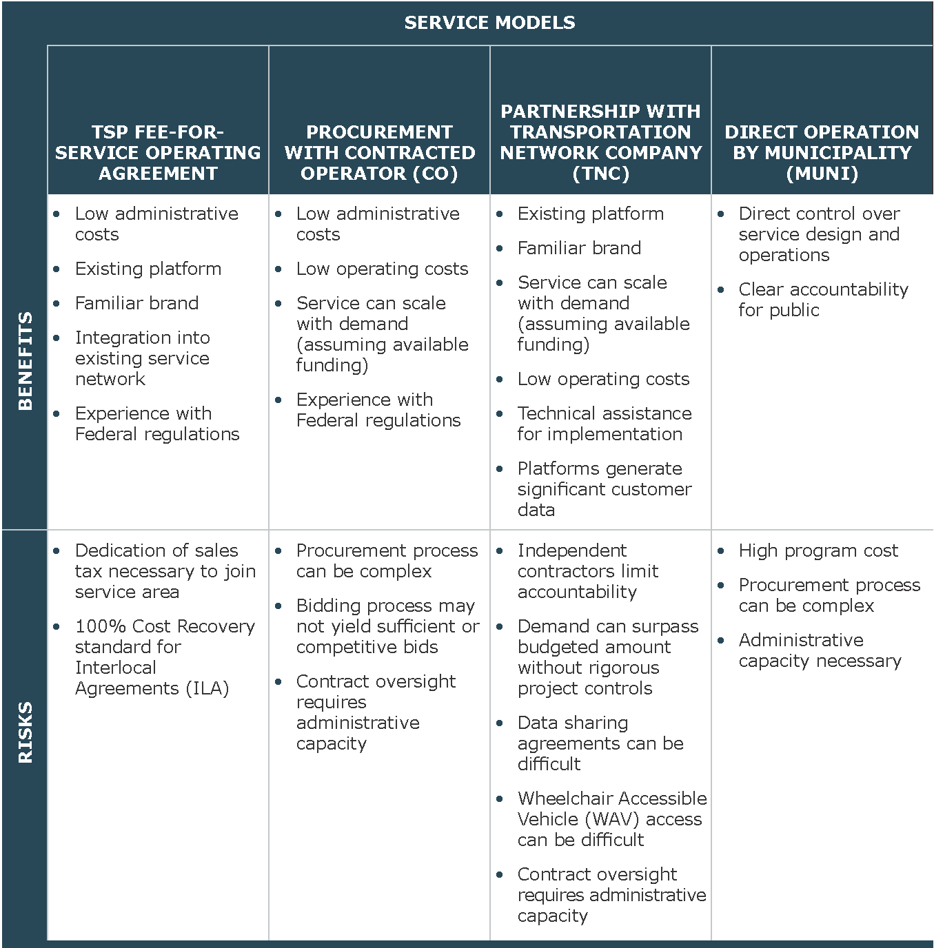 The Implementation Plan presents an array of service choices with guiding questions and a critical pathway to analyzing transit options, selecting from among them, and implementing the chosen service. Four transit service delivery options (Service Models) are outlined; the table below presents an overview of the benefits and risks associated with each service model: